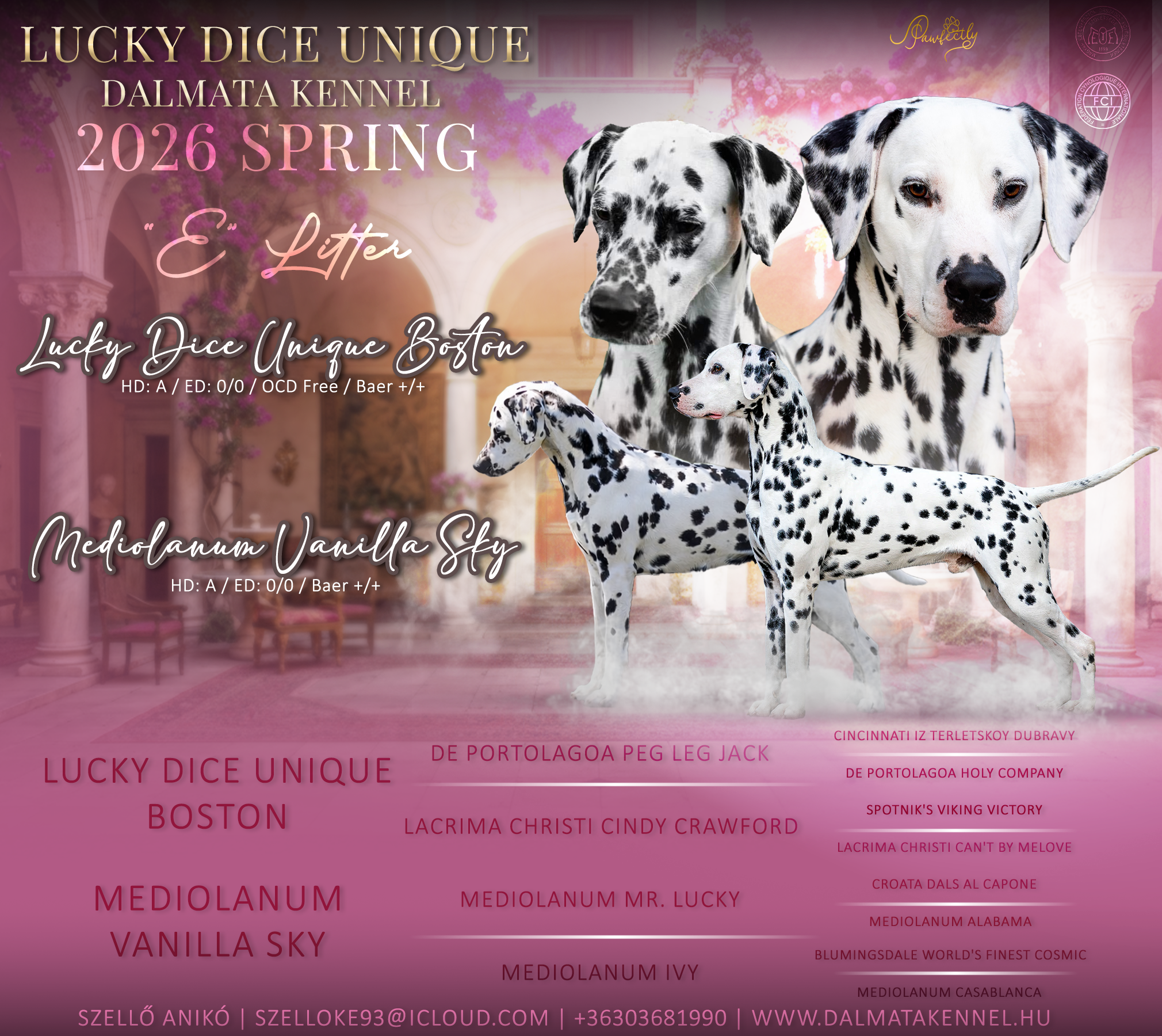 Eladó kutyusaink mind kiváló felmenőkkel büszkélkedhetnek. Nagy hangsúlyt fektetünk rá, hogy mind fizikailag, mind szellemileg kiemelkedő tulajdonságú szülőkkel megáldott kölykök kerüljenek új családba. Minden alom esetében elsődleges szempontunk a fajta egészségének megőrzése és a kiegyensúlyozott, szeretetteljes temperamentum. Célunk, hogy a dalmatáink teljes, boldog, kiegyensúlyozott életet élhessenek az új gazdájuk mellett.