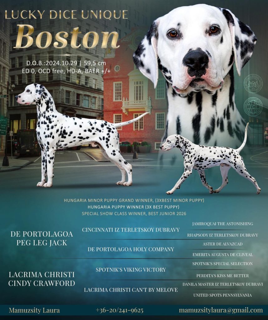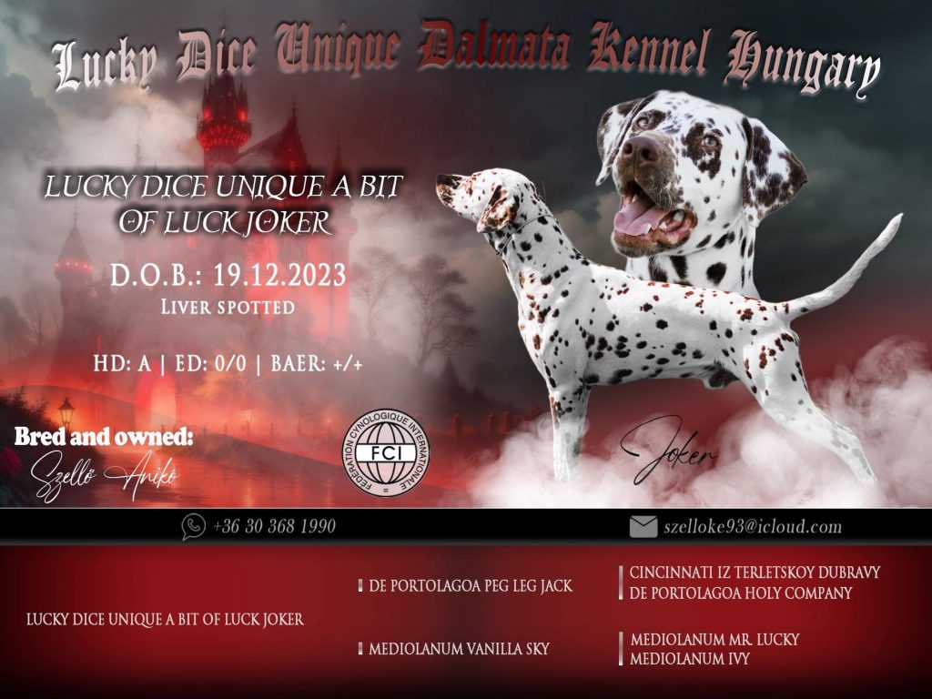 Kiváló felépítésű, kiegyensúlyozott idegrendszerű, barna pöttyös (liver spotted) dalmata kan, kimagasló származással.